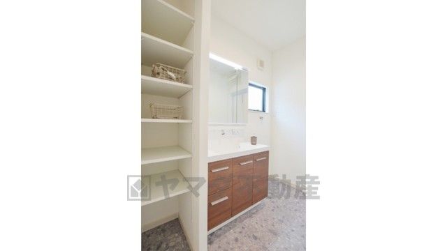 洗面台横には可動式の収納棚完備