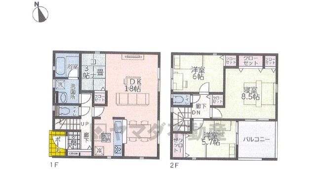 LDK18畳、和3畳、洋6畳、洋5.7畳、洋8.5畳 |