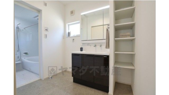 三面鏡タイプの洗面台横には可動式の収納棚