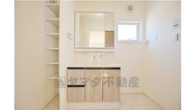 可動式の収納棚完備、三面鏡タイプの洗面台