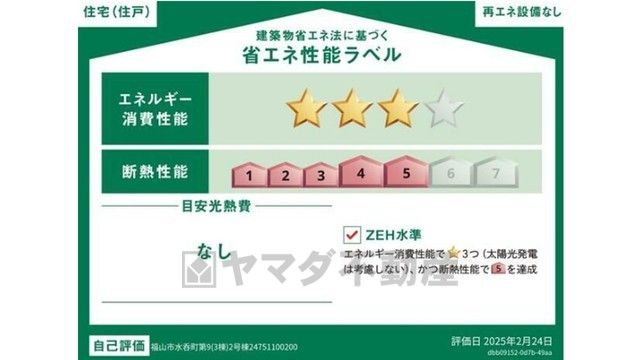 エネルギー消費性能(削減率20%達成)、断熱性能5段階/7段階中、本現場に関して全ての棟の「エネルギー消費性能」と「断熱性能」は代表棟ラベルと同一です。
