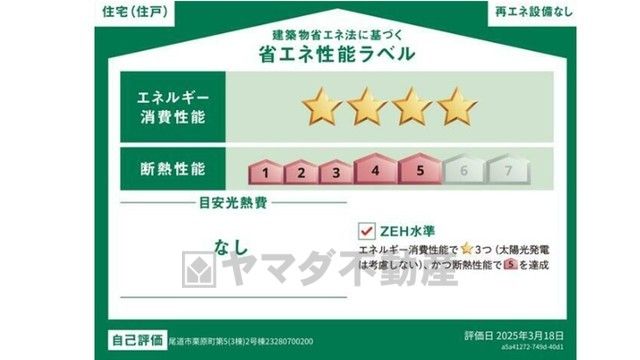 エネルギー消費性能(削減率30%達成)、断熱性能5段階/7段階中、本現場に関して全ての棟の「エネルギー消費性能」と「断熱性能」は代表棟ラベルと同一です。