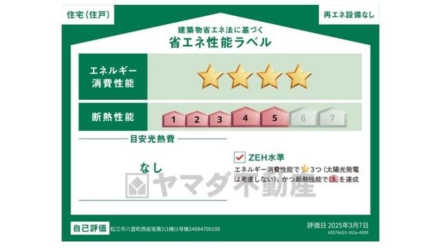 エネルギー消費性能(削減率20%達成)、断熱性能5段階/7段階中、本現場に関して全ての棟の「エネルギー消費性能」と「断熱性能」は代表棟ラベルと同一です。